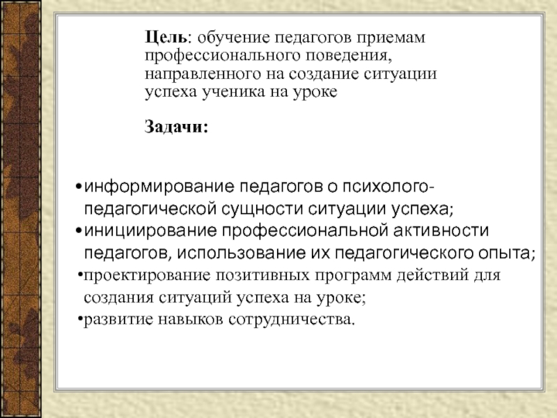 информирование педагогов о психолого-педагогической сущности ситуации успеха;