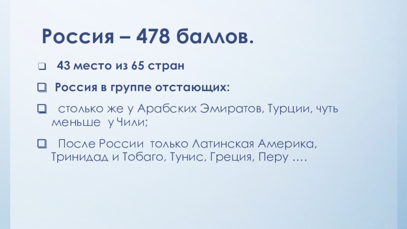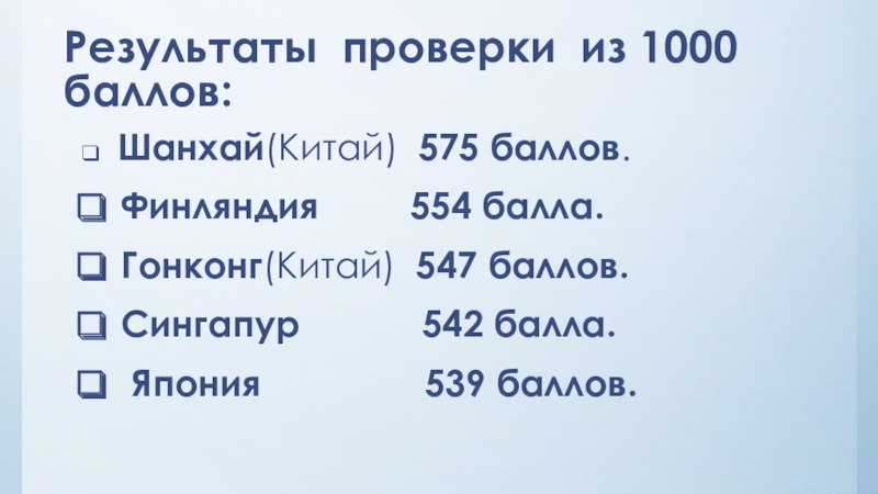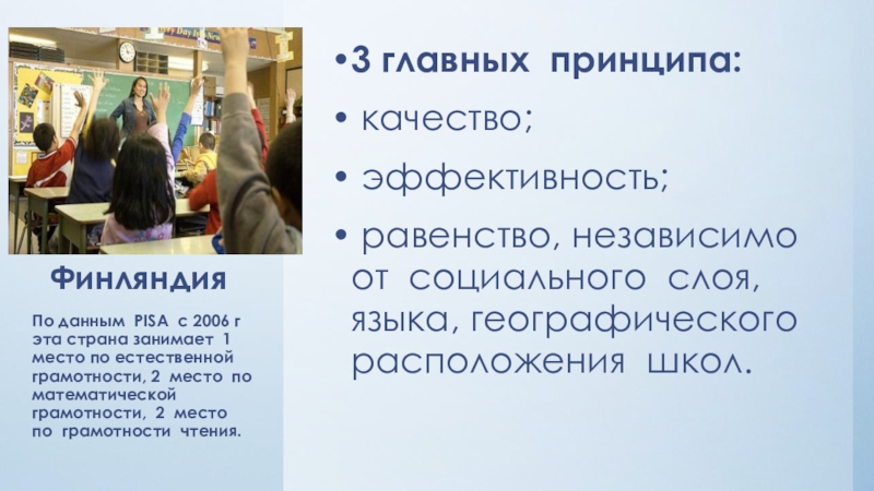 По данным PISA с 2006 г эта страна занимает 1 место по естественной грамотности, 2 место по математической грамотности, 2 место по грамотности чтения.