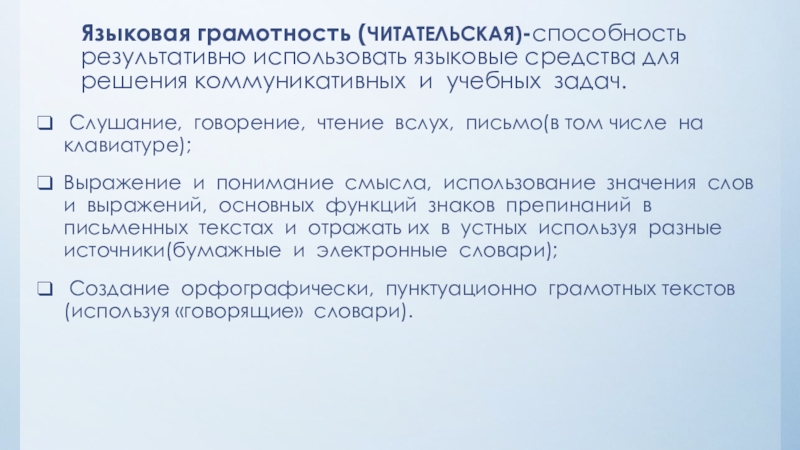Слушание, говорение, чтение вслух, письмо(в том числе на клавиатуре);