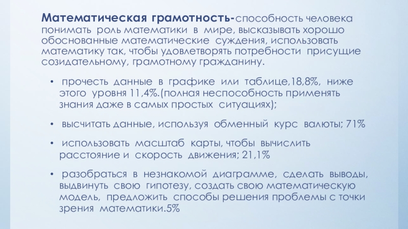Математическая грамотность-способность человека понимать роль математики в мире, высказывать хорошо обоснованные математические суждения, использовать математику так, чтобы удовлетворять потребности присущие созидательному, грамотному гражданину.