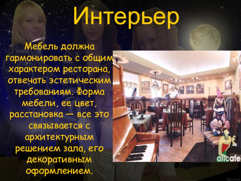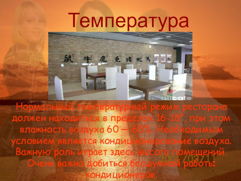Нормальный температурный режим ресторана должен находиться в пределах 16-18°, при этом влажность воздуха 60 — 65%. Необходимым условием является кондиционирование воздуха. Важную роль играет здесь высота помещений. Очень важно добиться бесшумной работы кондиционеров.