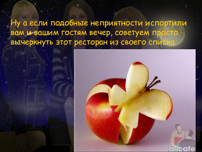 Ну а если подобные неприятности испортили вам и вашим гостям вечер, советуем просто вычеркнуть этот ресторан из своего списка.