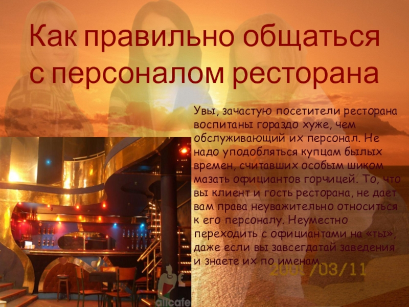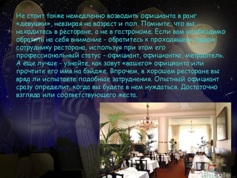 Не стоит также немедленно возводить официанта в ранг «девушки», невзирая на возраст и пол. Помните, что вы находитесь в ресторане, а не в гастрономе. Если вам необходимо обратить на себя внимание - обратитесь к проходящему рядом сотруднику ресторана, используя при этом его профессиональный статус - официант, официантка, метрдотель. А еще лучше - узнайте, как зовут «вашего» официанта или прочтите его имя на бэйдже. Впрочем, в хорошем ресторане вы вряд ли испытаете подобные затруднения. Опытный официант сразу определит, когда вы будете в нем нуждаться. Достаточно взгляда или соответствующего жеста.