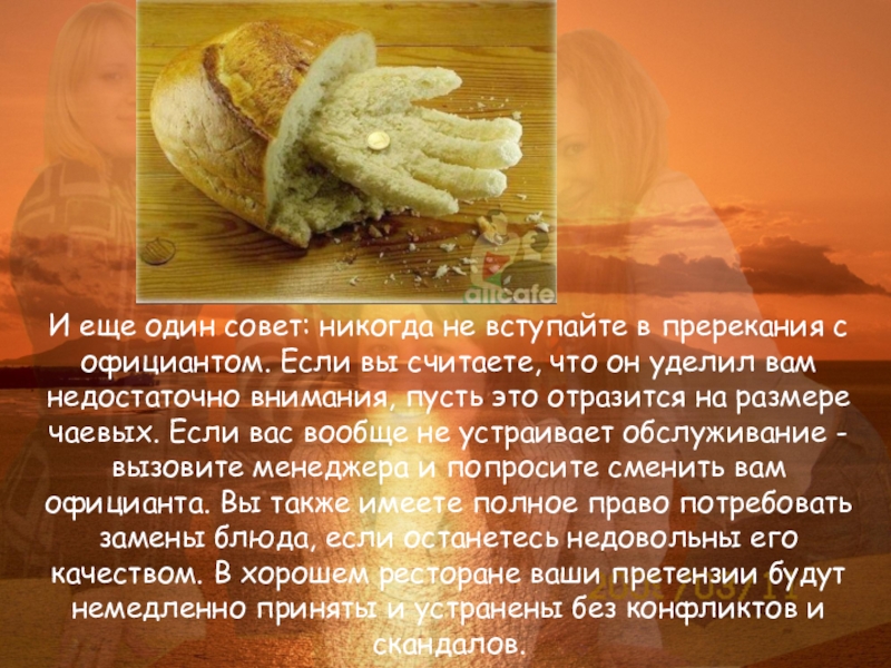 И еще один совет: никогда не вступайте в пререкания с официантом. Если вы считаете, что он уделил вам недостаточно внимания, пусть это отразится на размере чаевых. Если вас вообще не устраивает обслуживание - вызовите менеджера и попросите сменить вам официанта. Вы также имеете полное право потребовать замены блюда, если останетесь недовольны его качеством. В хорошем ресторане ваши претензии будут немедленно приняты и устранены без конфликтов и скандалов.