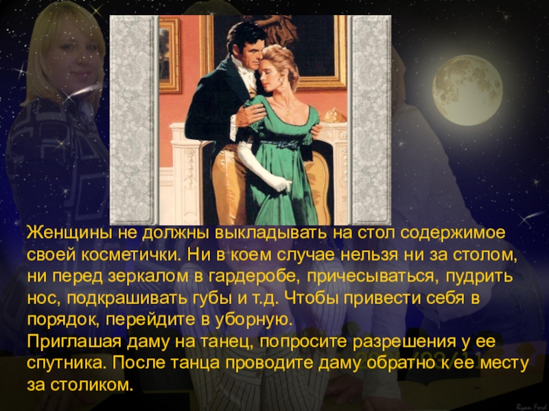 Женщины не должны выкладывать на стол содержимое своей косметички. Ни в коем случае нельзя ни за столом, ни перед зеркалом в гардеробе, причесываться, пудрить нос, подкрашивать губы и т.д. Чтобы привести себя в порядок, перейдите в уборную.
