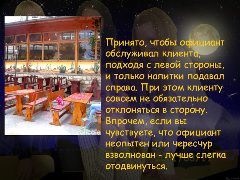Принято, чтобы официант обслуживал клиента, подходя с левой стороны, и только напитки подавал справа. При этом клиенту совсем не обязательно отклоняться в сторону. Впрочем, если вы чувствуете, что официант неопытен или чересчур взволнован - лучше слегка отодвинуться.