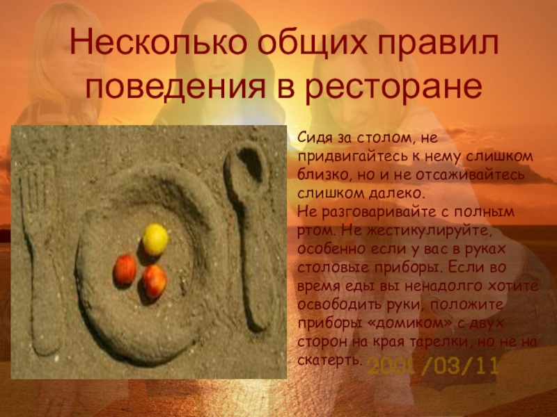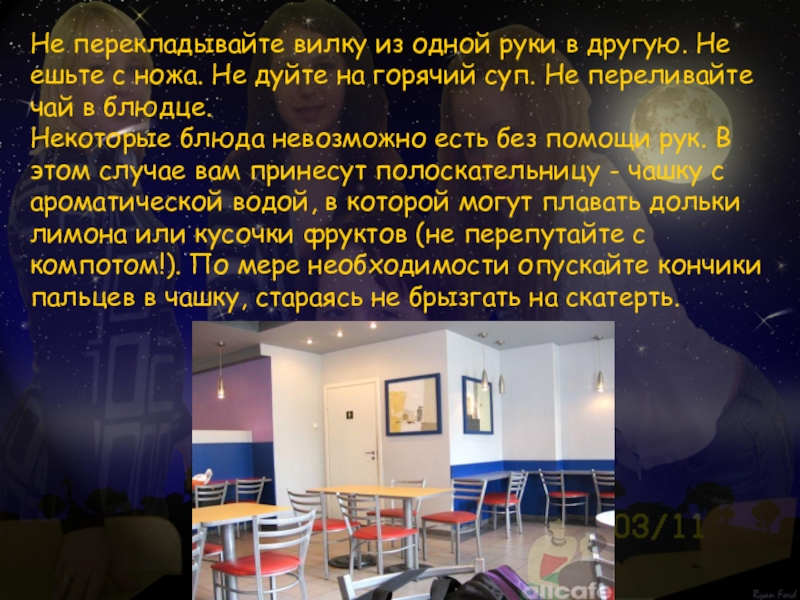Не перекладывайте вилку из одной руки в другую. Не ешьте с ножа. Не дуйте на горячий суп. Не переливайте чай в блюдце.