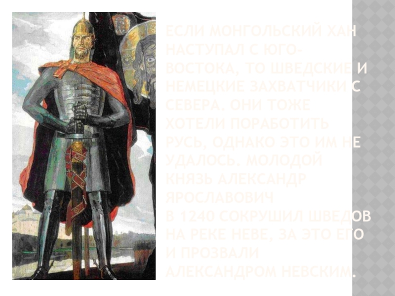 с севера. Они тоже хотели поработить Русь, однако это им не удалось. Молодой князь Александр Ярославович в 1240 сокрушил шведов на реке Неве, за это его и прозвали Александром Невским.