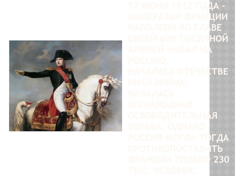 тысячной армией напал на Россию. Началась Отечественная война, началась всенародная освободительная борьба. Однако Россия могла тогда противопоставить Франции только 230 тыс. человек.