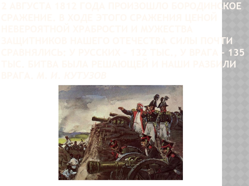 храбрости и мужества защитников нашего Отечества силы почти сравнялись: у русских – 132 тыс., у врага – 135 тыс. Битва была решающей и наши разбили врага. М. И. Кутузов