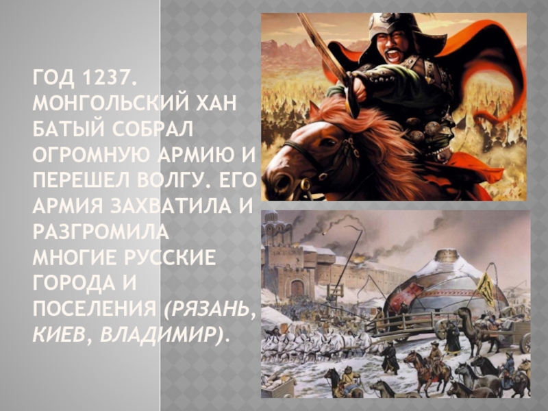 Слайд 4Год 1237. Монгольский хан Батый собрал огромную армию и перешел Волгу. Его