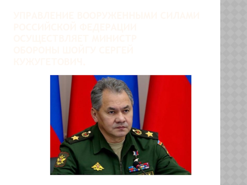 Слайд 16 Управление Вооруженными Силами Российской Федерации осуществляет Министр обороны Шойгу Сергей Кужугетович.