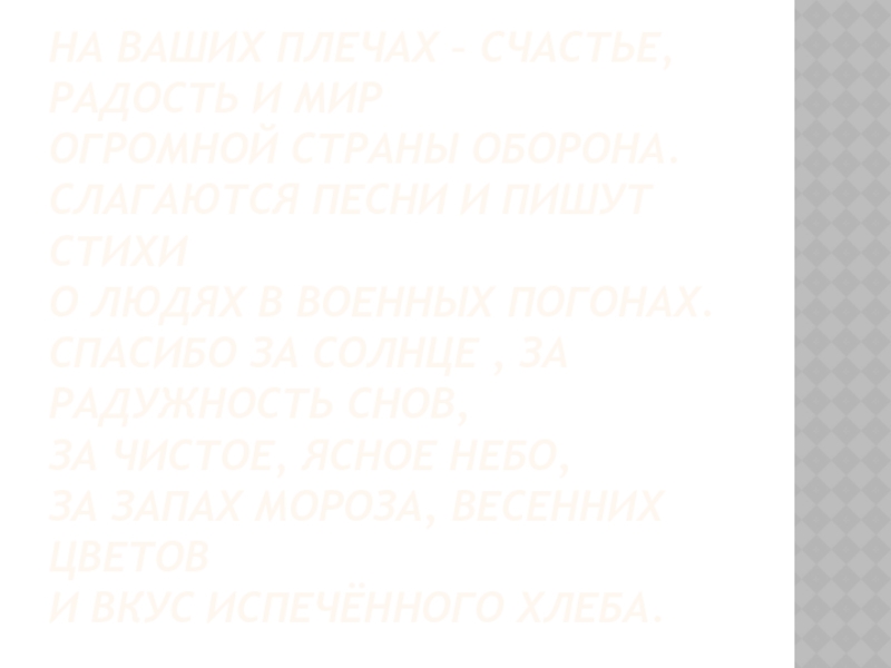 На ваших плечах – счастье, радость и мир Огромной страны оборона. Слагаются песни и пишут стихи О людях в военных погонах. Спасибо за