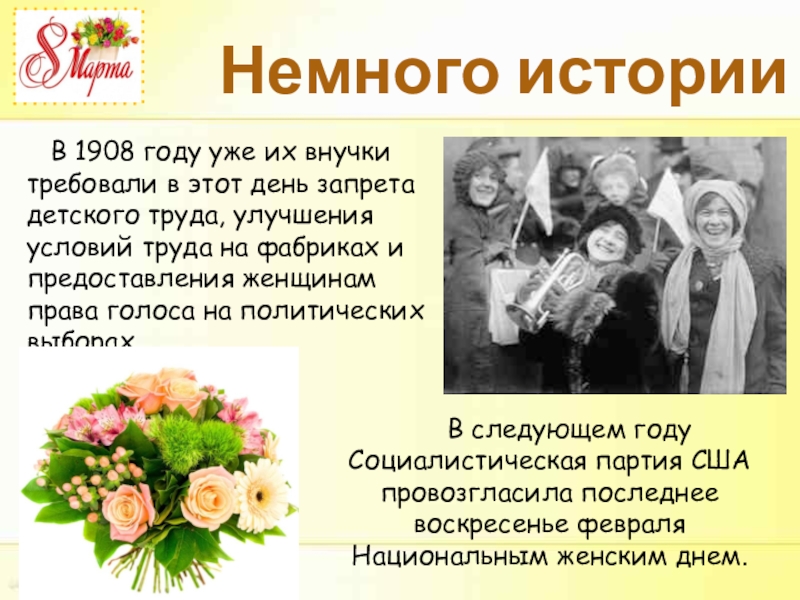 В следующем году Социалистическая партия США провозгласила последнее воскресенье февраля Национальным женским днем.