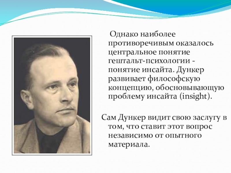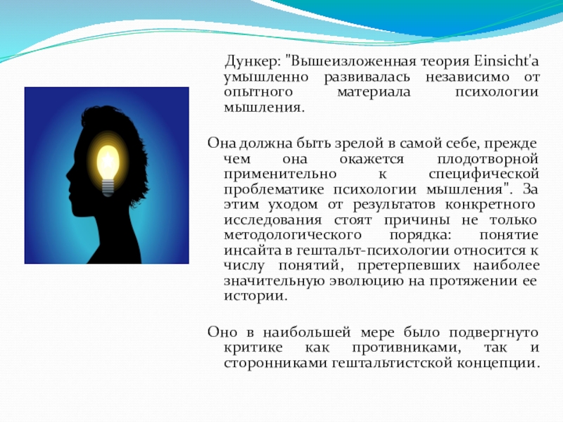 Слайд 8 Дункер: "Вышеизложенная теория Einsicht'a умышленно развивалась независимо от