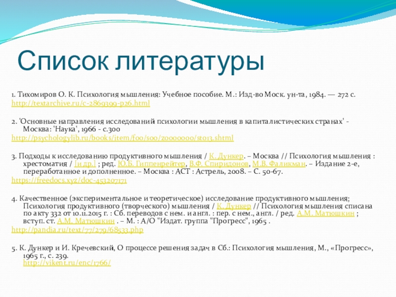 1. Тихомиров О. К. Психология мышления: Учебное пособие. М.: Изд-во