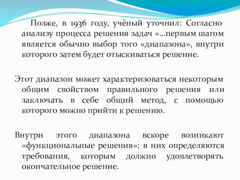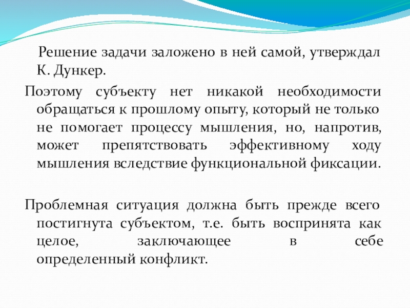 Слайд 10 Решение задачи заложено в ней самой, утверждал К. Дункер.