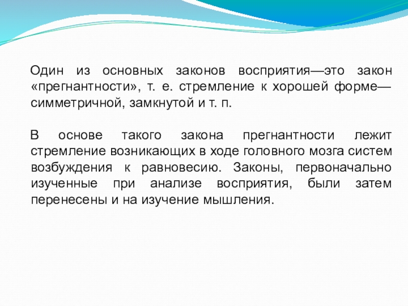 В основе такого закона прегнантности лежит стремление возникающих в ходе головного мозга систем возбуждения к равновесию. Законы, первоначально изученные при анализе восприятия, были затем перенесены и на изучение мышления.