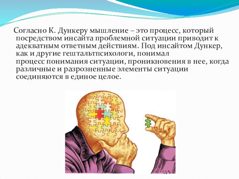 Слайд 9 Согласно К. Дункеру мышление – это процесс, который посредством инсайта