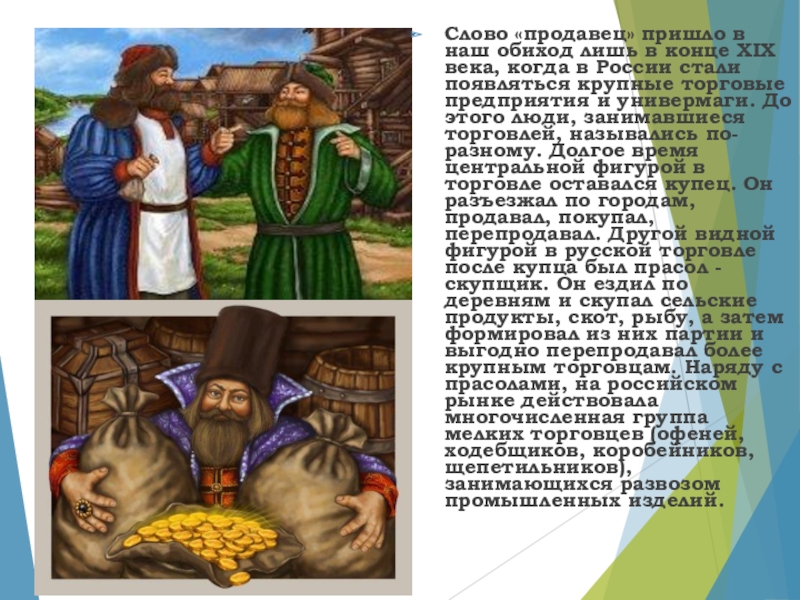 когда в России стали появляться крупные торговые предприятия и универмаги. До этого люди, занимавшиеся торговлей, назывались по-разному. Долгое время центральной фигурой в торговле оставался купец. Он разъезжал по городам, продавал, покупал, перепродавал. Другой видной фигурой в русской торговле после купца был прасол - скупщик. Он ездил по деревням и скупал сельские продукты, скот, рыбу, а затем формировал из них партии и выгодно перепродавал более крупным торговцам. Наряду с прасолами, на российском рынке действовала многочисленная группа мелких торговцев (офеней, ходебщиков, коробейников, щепетильников), занимающихся развозом промышленных изделий.