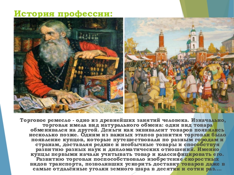 имела вид натурального обмена: один вид товара обменивался на другой. Деньги как эквивалент товаров появились несколько позже. Одним из важных этапов развития торговли было появление купцов, которые путешествовали по разным городам и странам, доставляя редкие и необычные товары и способствуя развитию разных наук и дипломатических отношений. Именно купцы первыми начали учитывать товар и классифицировать его.