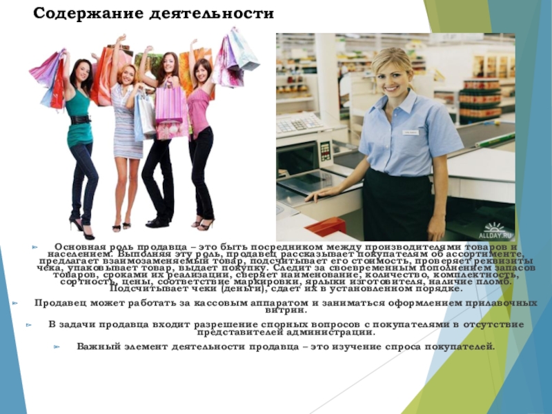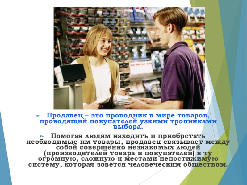 Слайд 11Продавец – это проводник в мире товаров, проводящий покупателей узкими тропинками