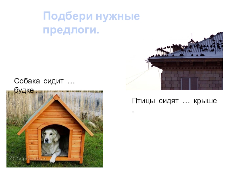 Подбери нужные предлоги.Птицы сидят … крыше .Собака сидит … будке .