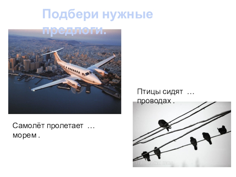 Подбери нужные предлоги.Самолёт пролетает … морем .Птицы сидят … проводах .