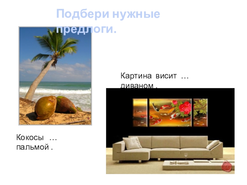 Подбери нужные предлоги.Кокосы  …  пальмой .Картина висит …  диваном .