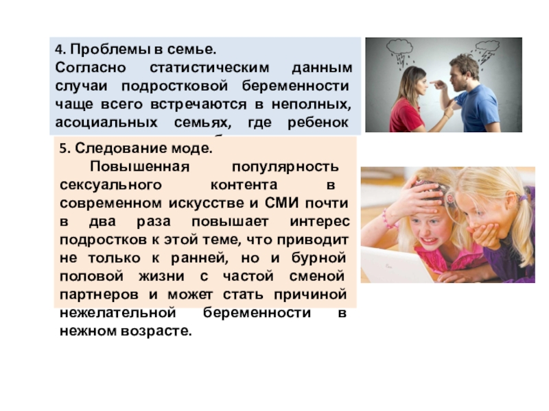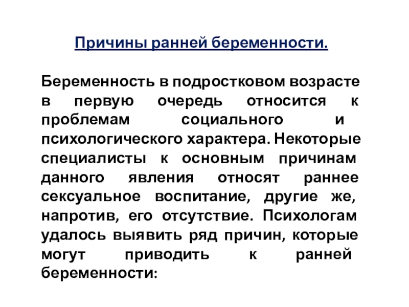проблемам социального и психологического характера. Некоторые специалисты к основным причинам данного явления относят раннее сексуальное воспитание, другие же, напротив, его отсутствие. Психологам удалось выявить ряд причин, которые могут приводить к ранней беременности: