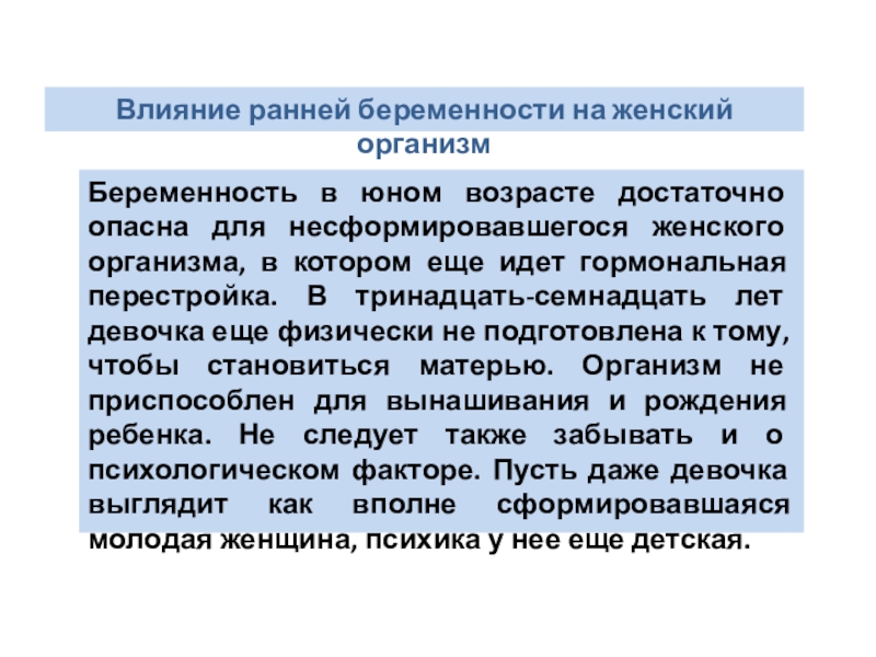 котором еще идет гормональная перестройка. В тринадцать-семнадцать лет девочка еще физически не подготовлена к тому, чтобы становиться матерью. Организм не приспособлен для вынашивания и рождения ребенка. Не следует также забывать и о психологическом факторе. Пусть даже девочка выглядит как вполне сформировавшаяся молодая женщина, психика у нее еще детская.