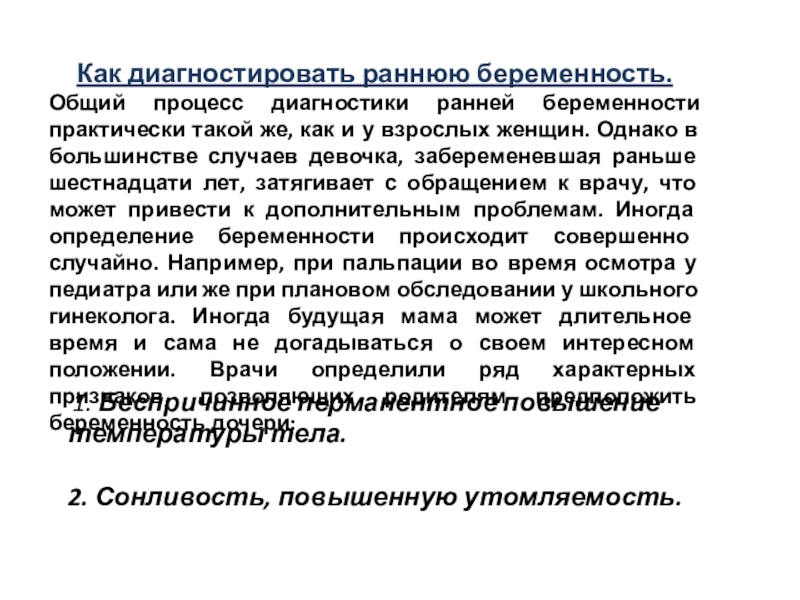 как и у взрослых женщин. Однако в большинстве случаев девочка, забеременевшая раньше шестнадцати лет, затягивает с обращением к врачу, что может привести к дополнительным проблемам. Иногда определение беременности происходит совершенно случайно. Например, при пальпации во время осмотра у педиатра или же при плановом обследовании у школьного гинеколога. Иногда будущая мама может длительное время и сама не догадываться о своем интересном положении. Врачи определили ряд характерных признаков, позволяющих родителям предположить беременность дочери: