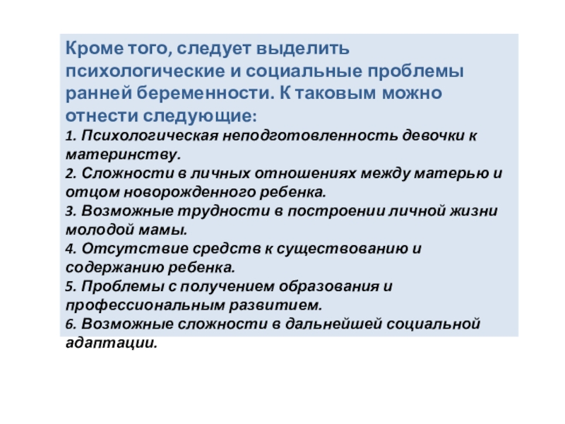 Слайд 14Кроме того, следует выделить психологические и социальные проблемы ранней беременности. К