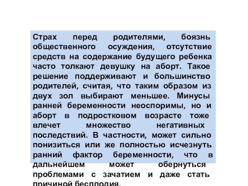 Слайд 8Страх перед родителями, боязнь общественного осуждения, отсутствие средств на содержание будущего