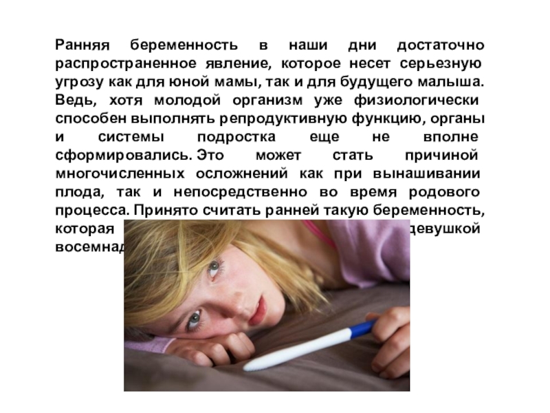 Слайд 2Ранняя беременность в наши дни достаточно распространенное явление, которое несет серьезную