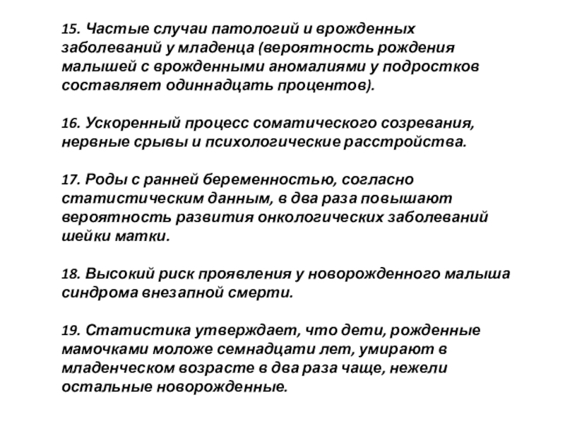 19. Статистика утверждает, что дети, рожденные мамочками моложе семнадцати лет, умирают в младенческом возрасте в два раза чаще, нежели остальные новорожденные.