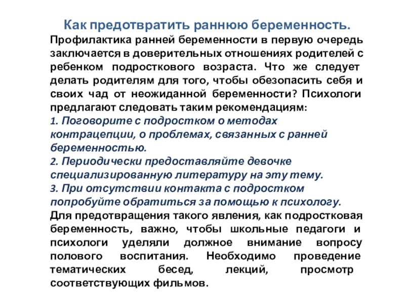 доверительных отношениях родителей с ребенком подросткового возраста. Что же следует делать родителям для того, чтобы обезопасить себя и своих чад от неожиданной беременности? Психологи предлагают следовать таким рекомендациям: