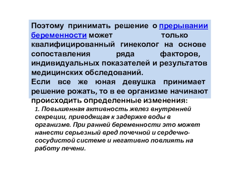 Слайд 9Поэтому принимать решение о прерывании беременности может только квалифицированный гинеколог на основе сопоставления