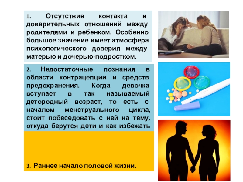 1. Поговорите с подростком о методах контрацепции, о проблемах, связанных с ранней беременностью.