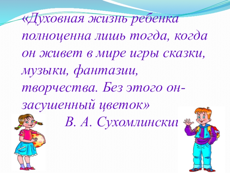 Слайд 27«Духовная жизнь ребенка полноценна лишь тогда, когда он живет в мире