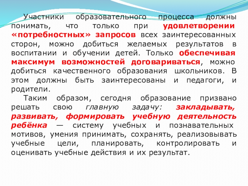 Слайд 33 Участники образовательного процесса должны понимать, что только при удовлетворении «потребностных» запросов