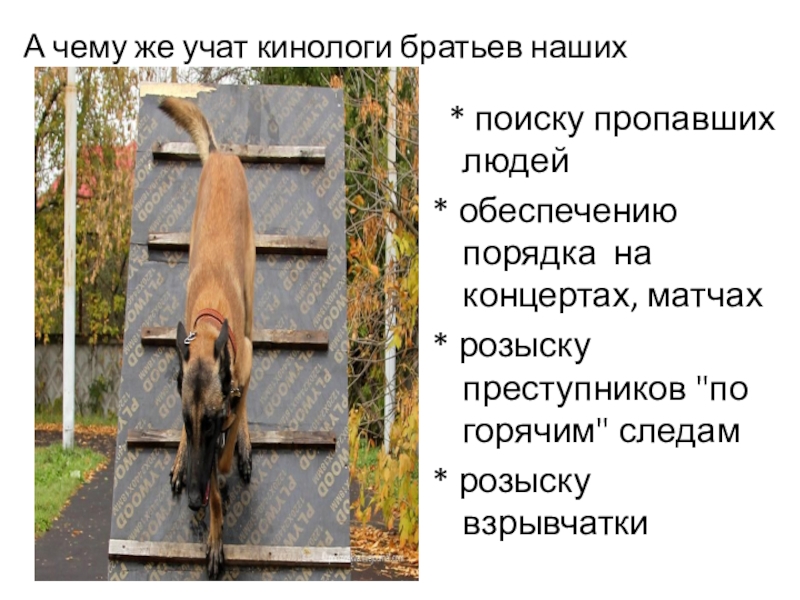 А чему же учат кинологи братьев наших меньших? * поиску пропавших людей* обеспечению порядка на концертах, матчах*
