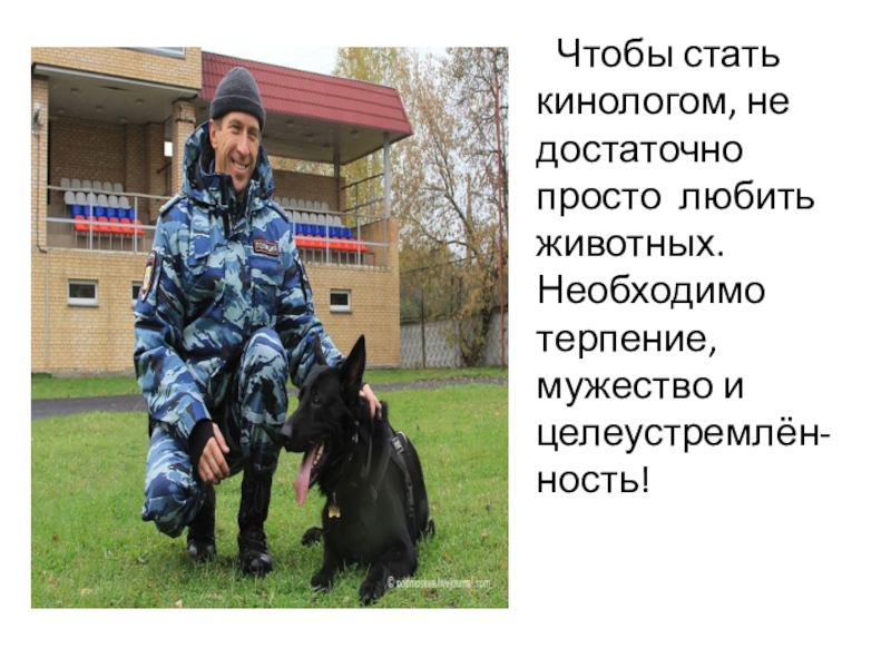 Слайд 7 Чтобы стать кинологом, не достаточно просто любить животных.