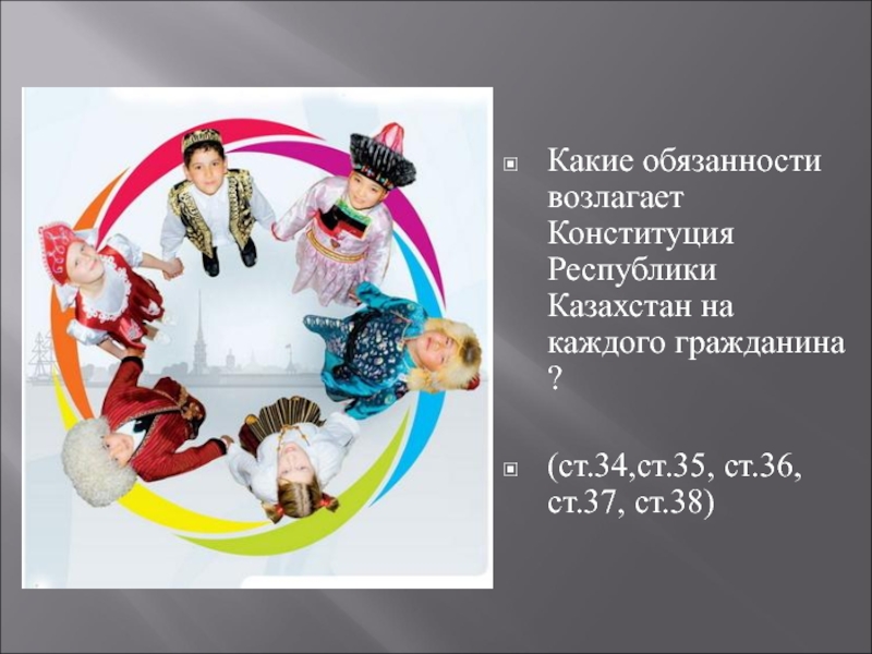 Слайд 3Какие обязанности возлагает Конституция Республики Казахстан на каждого гражданина ?