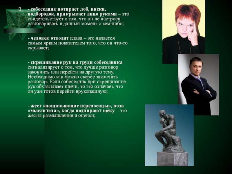Слайд 13- собеседник потирает лоб, виски, подбородок, прикрывает лицо руками – это