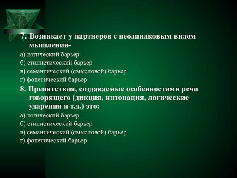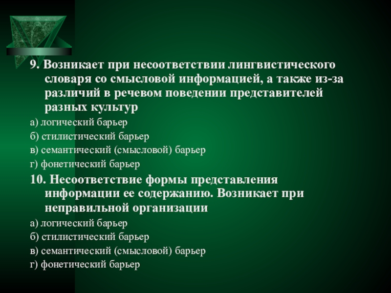 8. Препятствия, создаваемые особенностями речи говорящего (дикция, интонация, логические ударения и т.д.) это: