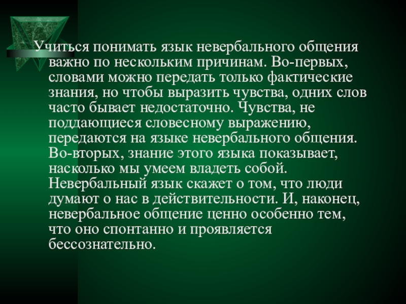 Слайд 17Учиться понимать язык невербального общения важно по нескольким причинам. Во-первых, словами