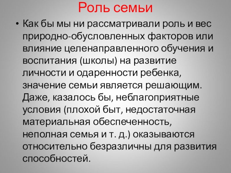или влияние целенаправленного обучения и воспитания (школы) на развитие личности и одаренности ребенка, значение семьи является решающим. Даже, казалось бы, неблагоприятные условия (плохой быт, недостаточная материальная обеспеченность, неполная семья и т. д.) оказываются относительно безразличны для развития способностей.