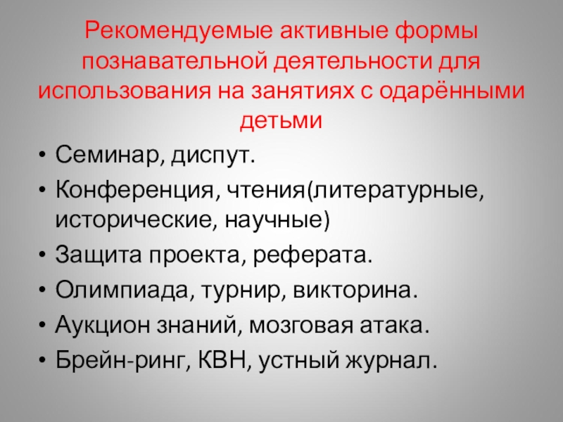 Слайд 15Рекомендуемые активные формы познавательной деятельности для использования на занятиях с одарёнными