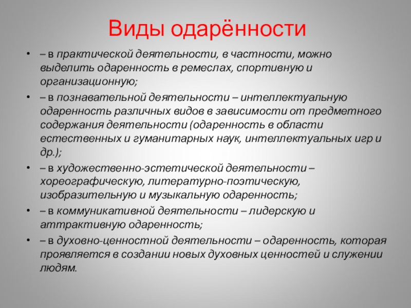 – в духовно-ценностной деятельности – одаренность, которая проявляется в создании новых духовных ценностей и служении людям.